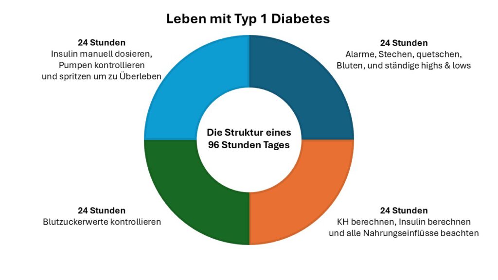 Hast du schon mal das Gefühl gehabt, dein Tag hat einfach zu viele Aufgaben? Menschen mit Typ-1-Diabetes kennen dieses Gefühl nur zu gut. Denn ein einziger Tag mit Diabetes fühlt sich oft an wie vier volle Tage in einem – wie 96 Stunden in 24 Stunden.